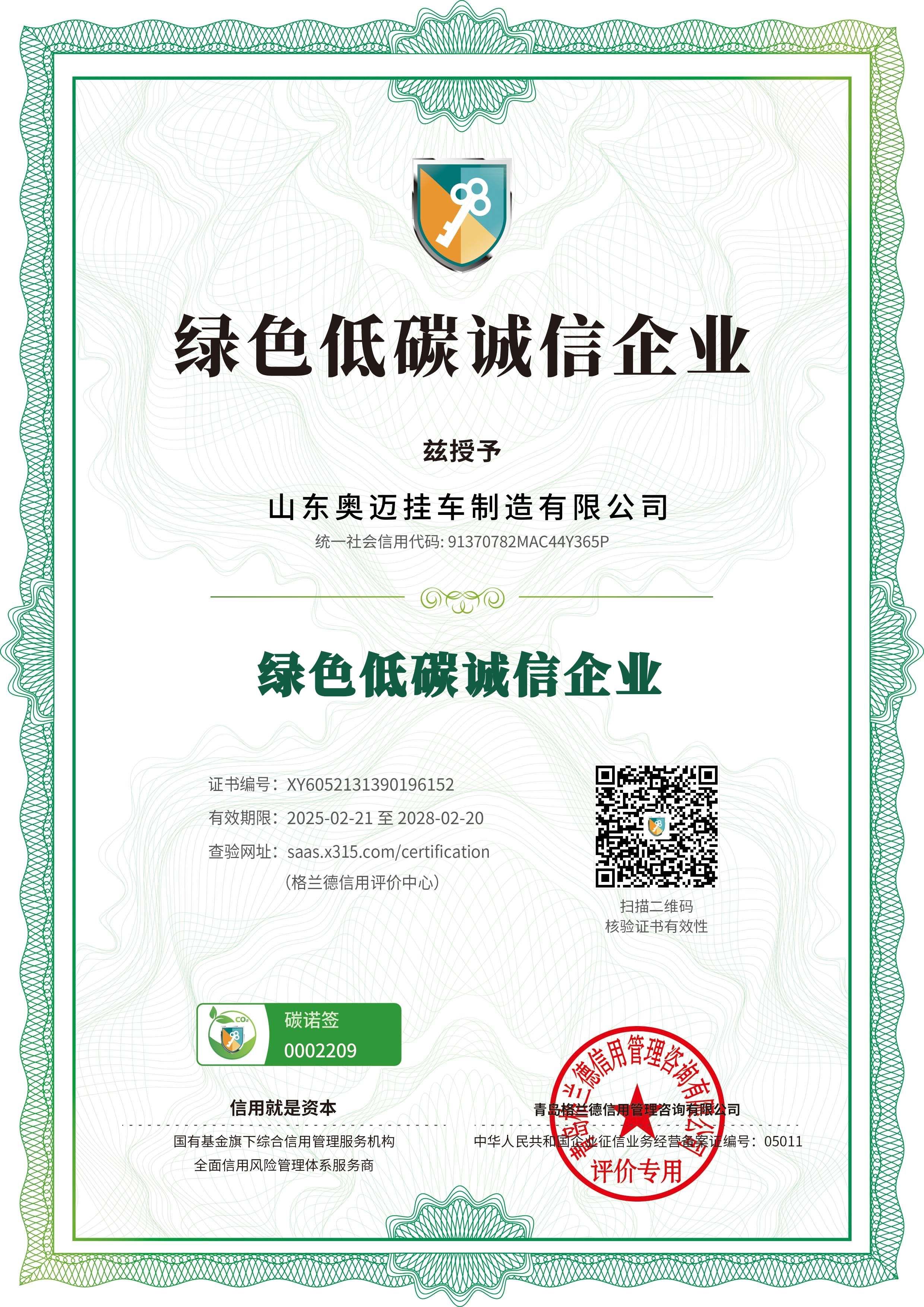 • Green and Low-Carbon Integrity Enterprise Certificate - Shandong Aoemai Trailer Mfg. Co., Ltd. (Issued by Grantland Credit Evaluation Center)​​